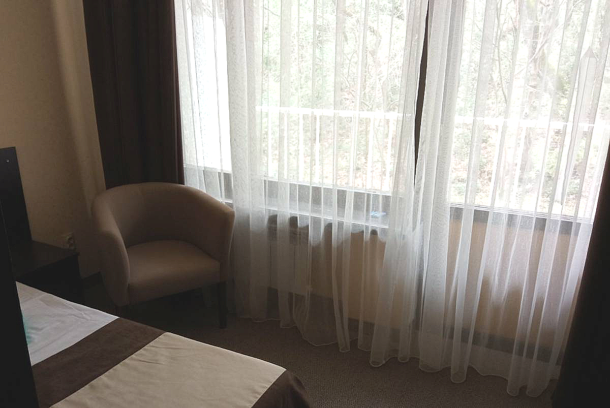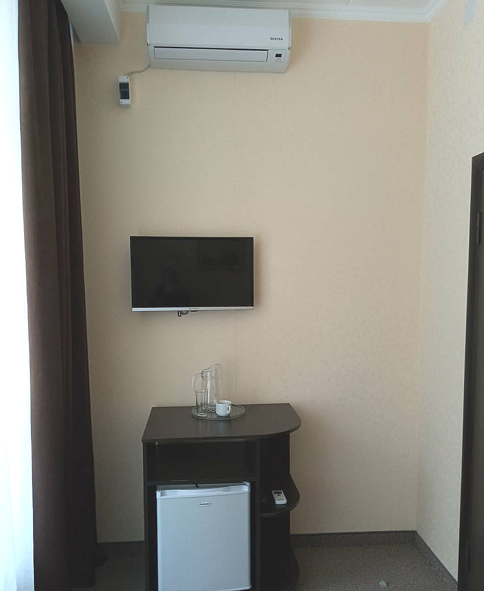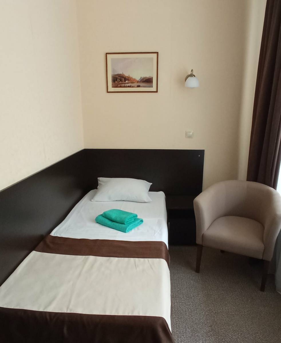 Площадь номера - 8-9 кв.м. 1 осн. место. 1 доп. место. Мебель: вешалка, зеркало, кровать односпальная, прикроватная тумбочка, стол, стул, тумба, шкаф. Оборудование: кондиционер, мини-холодильник, телевизор. Сервис: смена полотенец, смена постельного белья, уборка номера.