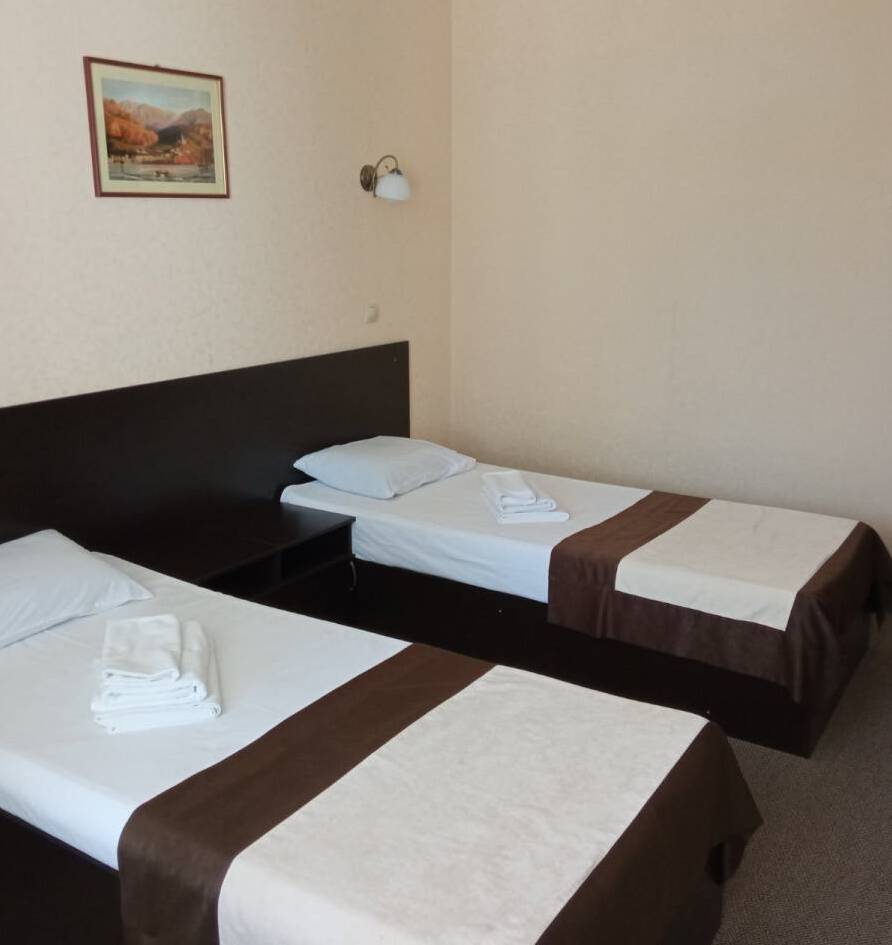 Площадь номера - 14-15 кв.м. 2 осн. места. 1 доп. место. Балкон. Мебель: вешалка, зеркало, кровати односпальные, прикроватные тумбочки, стол, стул, шкаф. Оборудование: кондиционер, мини-холодильник, телевизор. Санузел: с душем, туалетные принадлежности. Сервис: смена полотенец, смена постельного белья, уборка номера.